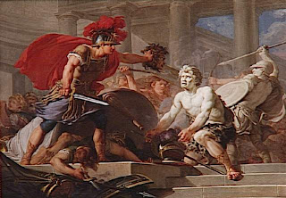 Nicosthénès (peintre). Tête de Gorgone. Énée et Anchise. Vers 520 av. J.-C. Nicosthénès. Tête de Gorgone. Énée et Anchise vers 520 av. J.-C. coupe à figures noires 33,5 cm x 33,5 cm [louvre.edu], photo Erich Lessing